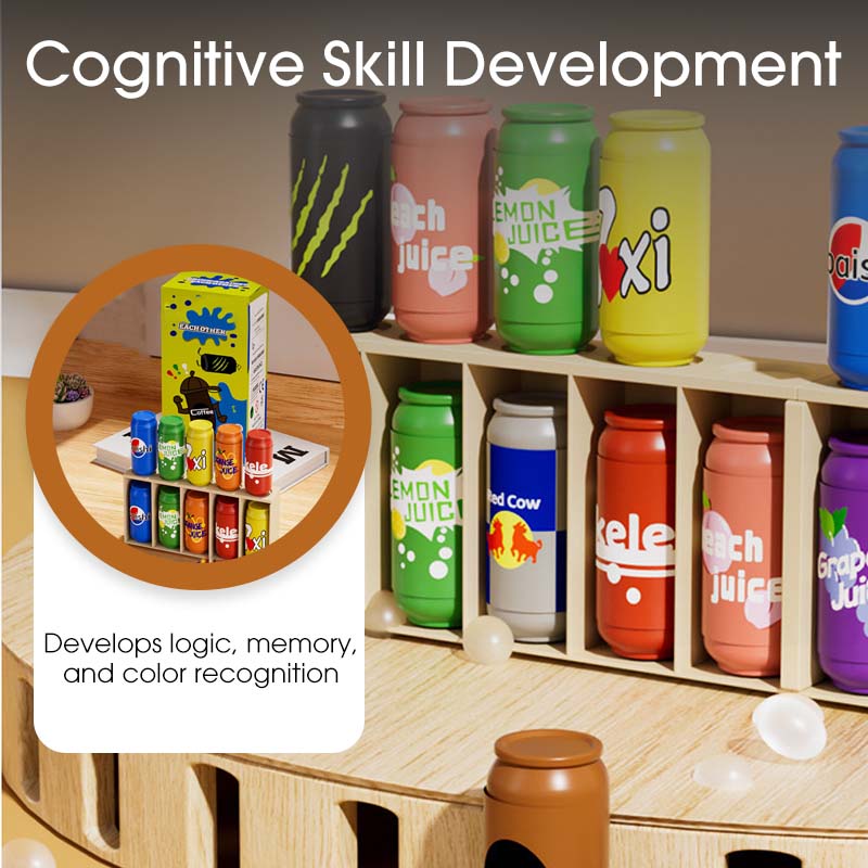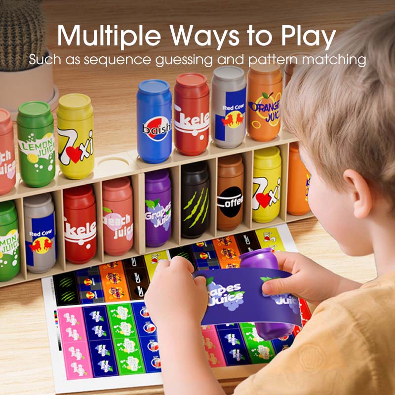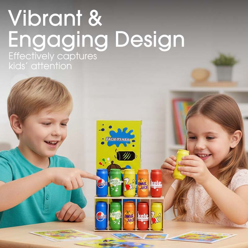 Zabawka posiada kolorowe, miniaturkowe puszki napojów, które wizualnie przyciągają uwagę dzieci. Jasne kolory i zabawnie wzory skutecznie trzymają ich uwagę, czyniąc proces nauki przyjemniejszym i zapewniając skupienie!